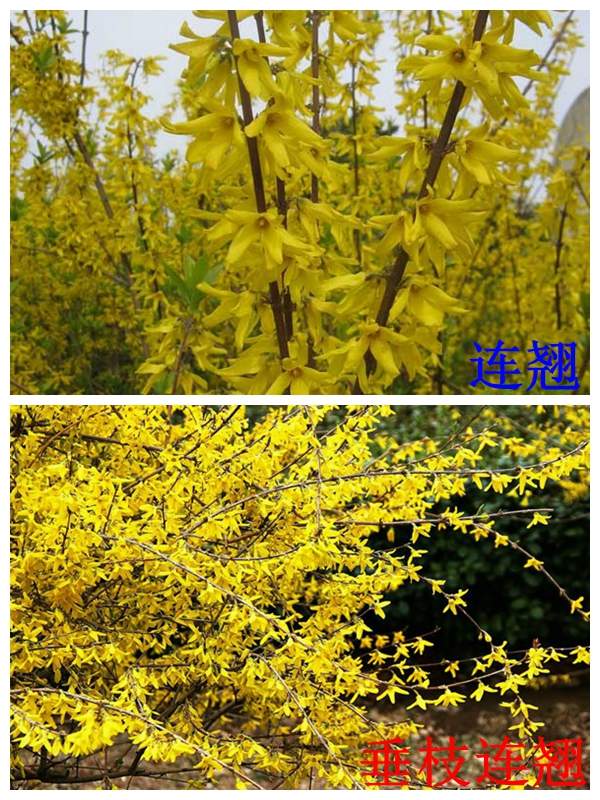垂枝連翹:垂枝連翹是連翹的變種,跟連翹非常的相似,,一般的連翹枝條生長的都比較直立,只不過枝條比較柔軟纖細(xì)呈下垂?fàn)顟B(tài),它的花期在3-5月,果期在7-9月。